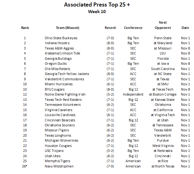 - Clemson Tigers (3–4): Once a College Football Playoff fixture, Clemson’s offense has sputtered, and the Tigers have fallen from the rankings for the first time in years.